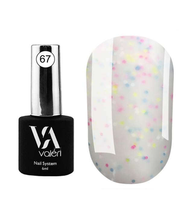 Колір: молочний з неоновими різнокольоровими точками. База вкрапленнями, середньої твердості, низькокислотна. Має самовирівнюючу структуру та гарно перекриває нігтьову пластину в одне нанесення. Не потребує додаткового опилу. Необхідна підложка із Rubber Base. Час полімеризації у UV/LED лампі 2х